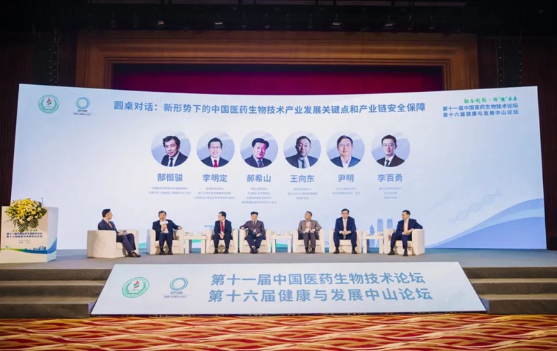在圓桌對(duì)話環(huán)節(jié),中國(guó)工程院院士、天津醫(yī)科大學(xué)原校長(zhǎng)、天津市腫瘤研究所所長(zhǎng)、國(guó)家腫瘤臨床醫(yī)學(xué)研究中心主任郝希山,歐洲科學(xué)院院士、復(fù)旦大學(xué)中山醫(yī)院特聘教授、首席科學(xué)家王向東,歐洲科學(xué)院外籍院士、浙江大學(xué)求是講席教授及博導(dǎo)、山西農(nóng)業(yè)大學(xué)生命科學(xué)學(xué)院學(xué)術(shù)院長(zhǎng)李明定,中山市委副秘書(shū)長(zhǎng)、發(fā)改局局長(zhǎng)尹明,中國(guó)醫(yī)藥生物技術(shù)協(xié)會(huì)副理事長(zhǎng)、生物芯片上海國(guó)家工程研究中心主任郜恒駿,康方生物聯(lián)合創(chuàng)始人、執(zhí)行副總裁、首席科學(xué)官李百勇等行業(yè)專家和企業(yè)家齊聚一堂,圍繞“新形勢(shì)下中國(guó)醫(yī)藥生物技術(shù)產(chǎn)業(yè)發(fā)展關(guān)鍵點(diǎn)和產(chǎn)業(yè)鏈安全保障”主題進(jìn)行了探討,并就“ ‘黃金內(nèi)灣’健康產(chǎn)業(yè)發(fā)展新機(jī)遇”等議題分享了精彩的觀點(diǎn)與思考。