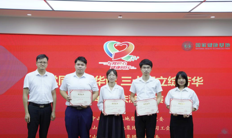 中山港街道總工會二級主任科員何健中與健康基地集團副總經(jīng)理黃遠輝為三等獎獲得者蔣鑫(招商統(tǒng)籌組)、郭培鑫(工程部)、劉賢進(經(jīng)濟發(fā)展部)頒獎