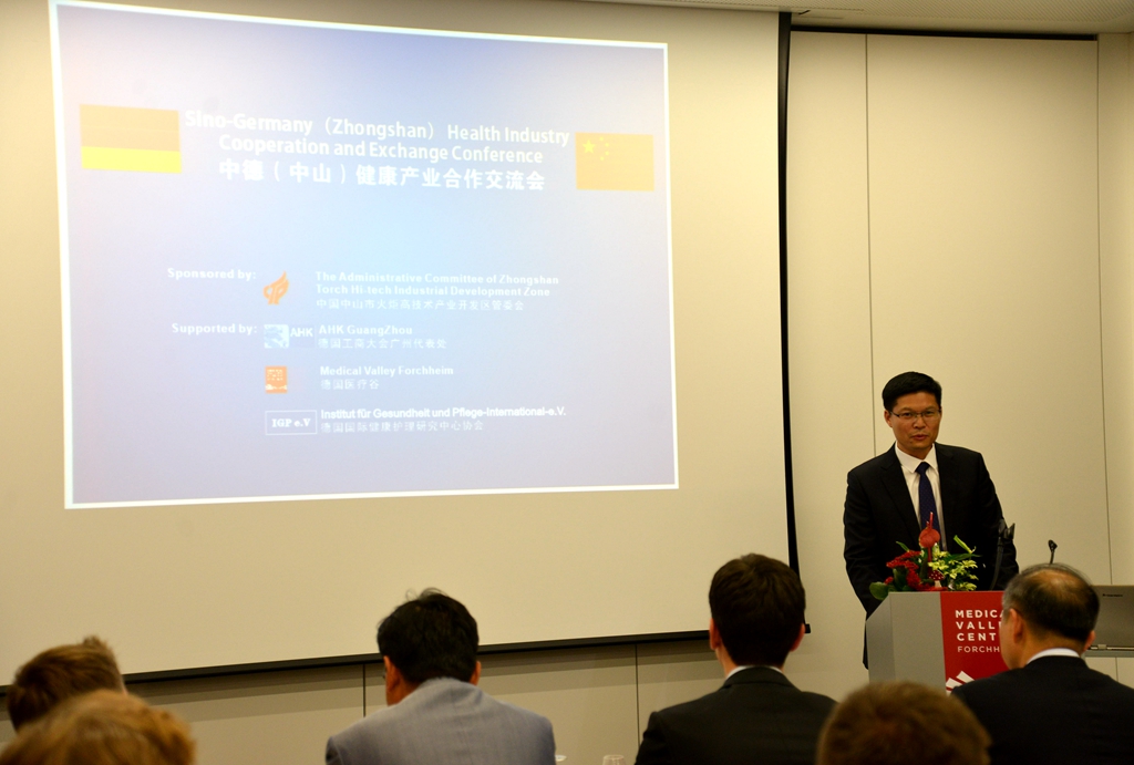 德國當?shù)貢r間9月21日晚,由市委常委、火炬開發(fā)區(qū)黨工委書記、翠亨新區(qū)黨工委書記侯奕斌率領的中山市經(jīng)貿(mào)代表團(下稱:經(jīng)貿(mào)團)在德國紐倫堡大區(qū)Forchheim市組織召開了中德健康產(chǎn)業(yè)合作推介會。此次合作交流會由中山火炬開發(fā)區(qū)主辦,得到德國工商大會廣州代表處、德國醫(yī)療谷、德國國際健康護理研究中心協(xié)會的大力支持。